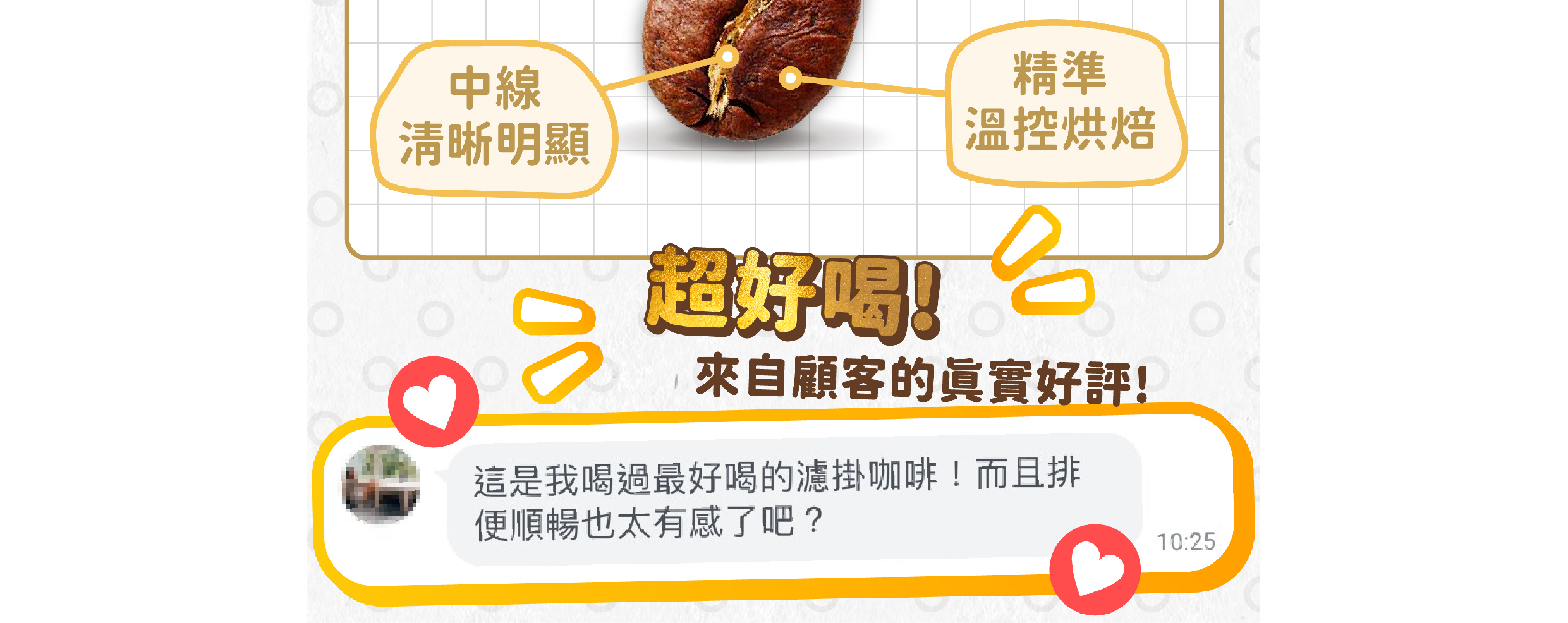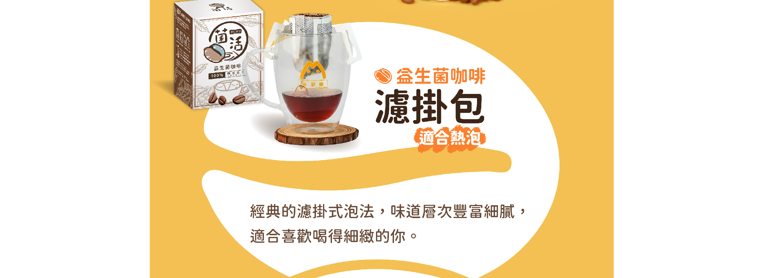 濾掛沖泡可以呈現出更層次的咖啡香氣,適合喜歡喝味道醇厚一點的人,甘甜而細膩,不會有苦澀味,添加了BC_T1耐熱益生菌,適合幫助維持消化道健康,享受生活的美好。