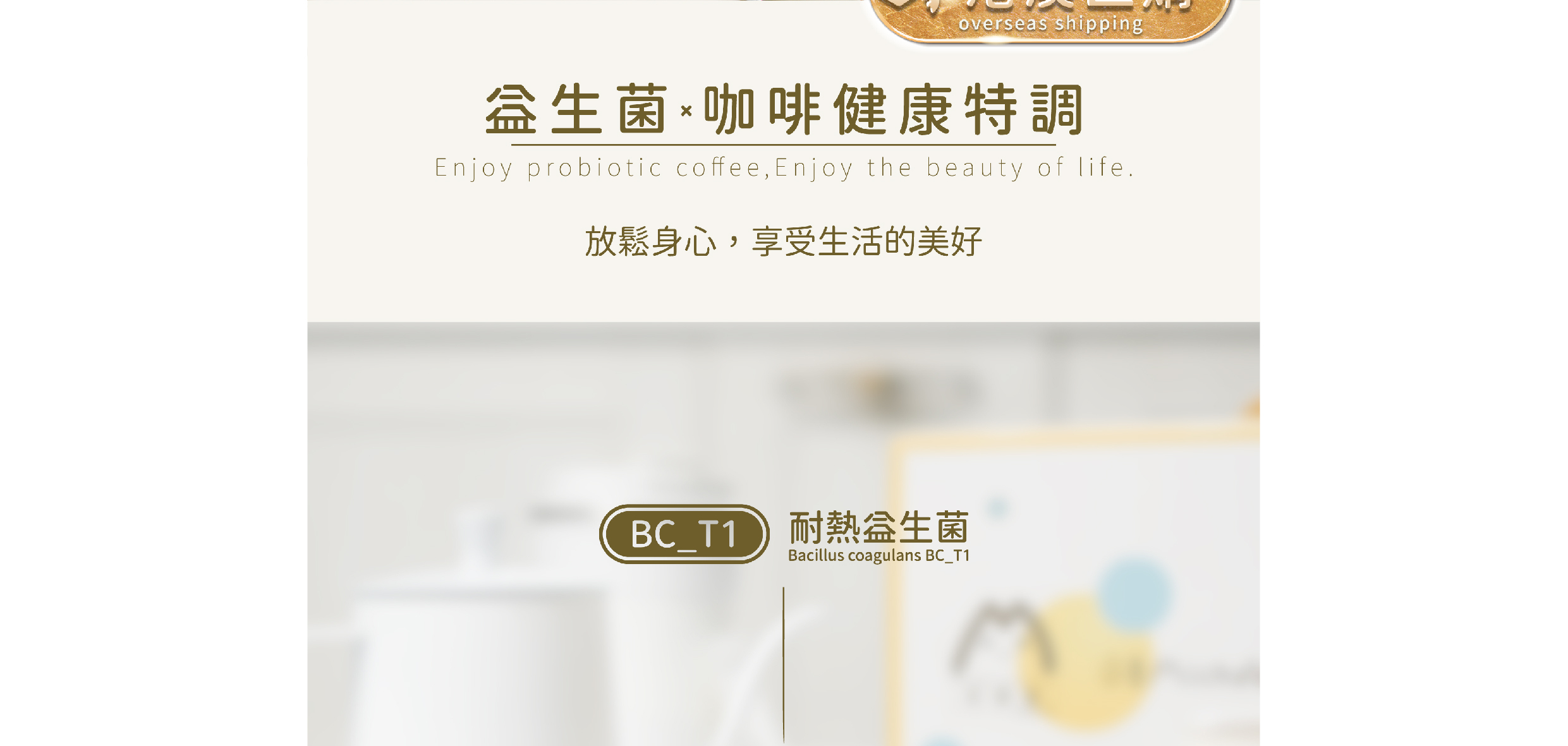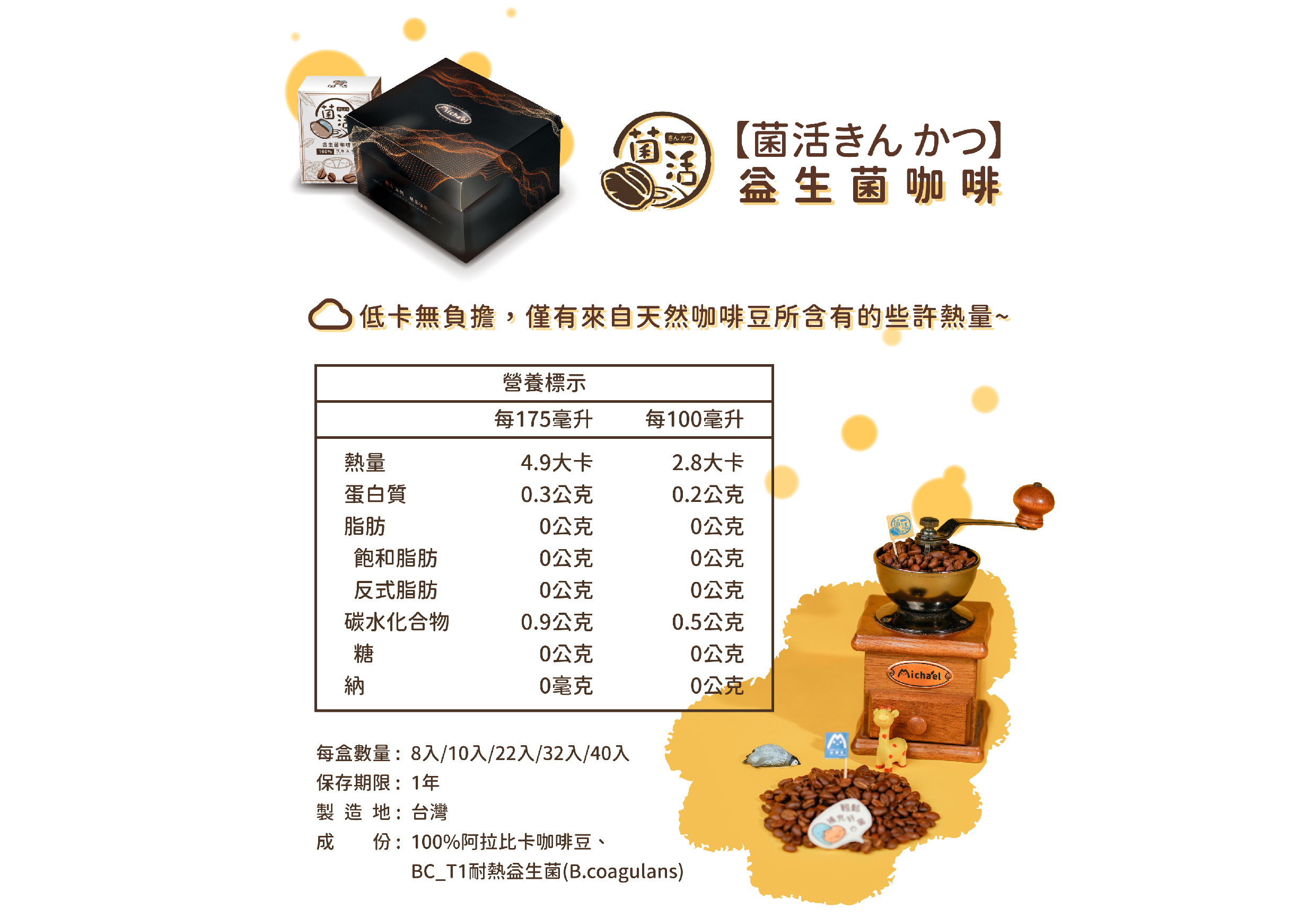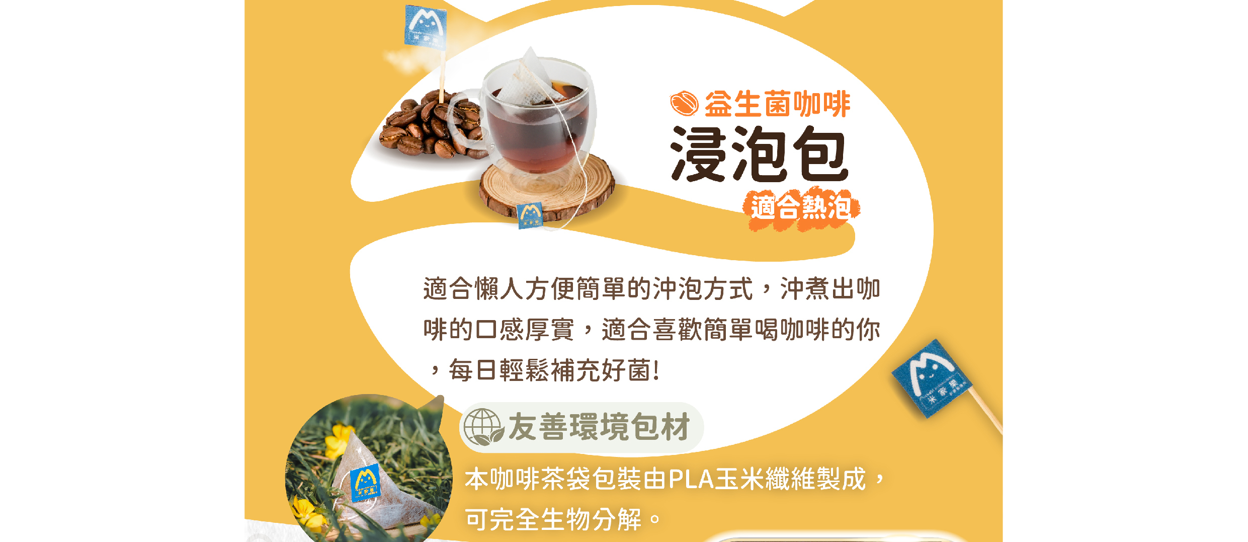 簡單浸泡在熱水中就能沖出甘甜的咖啡味,咖啡的苦甜味比較不明顯,感受上是更多的甜感與香氣,一樣具有特色幫助維持消化道健康的BC_T1耐熱益生菌。