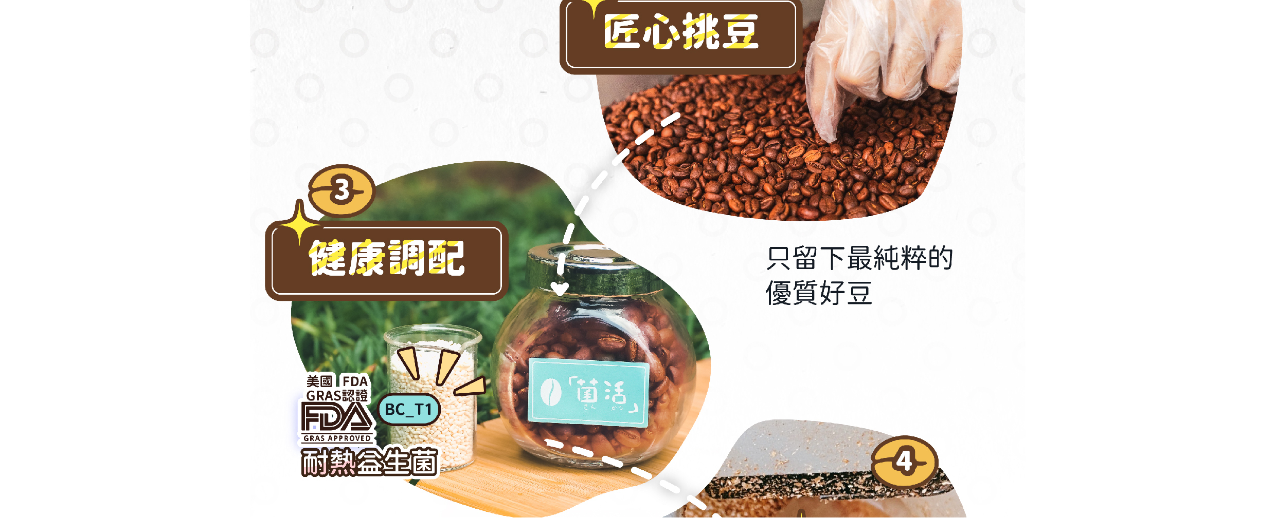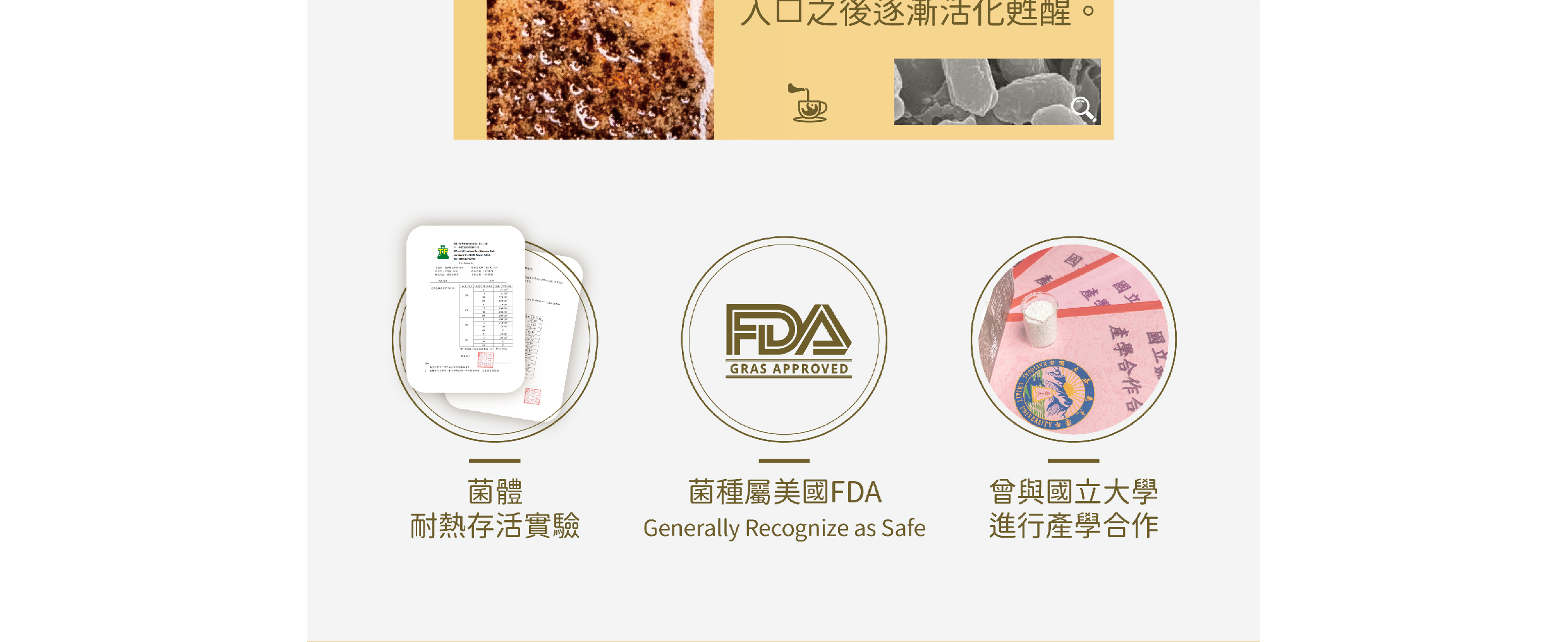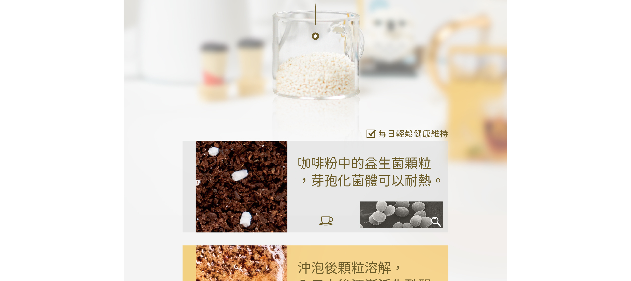 簡單浸泡在熱水中就能沖出甘甜的咖啡味,咖啡的苦甜味比較不明顯,感受上是更多的甜感與香氣,一樣具有特色幫助維持消化道健康的BC_T1耐熱益生菌。